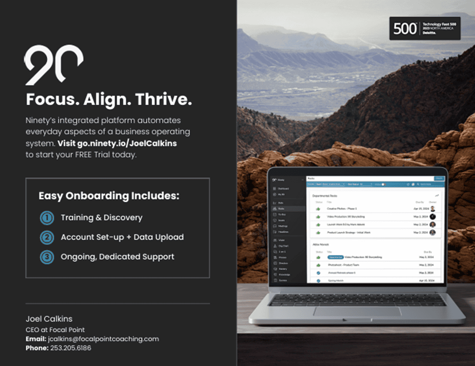 To keep your plan alive, you will use the Ninety platform to track goals, KPIs, and meetings in one simple, shared system. This makes it easier to keep everyone aligned, hold effective meetings, and keep your strategic priorities visible week after week.